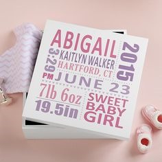 This gift includes a custom photo print of the baby on the day she turns one, along with all the important information about her like birthday, birthstone, news on the day she was born, etc. it makes for a great wall hanging in her baby room.